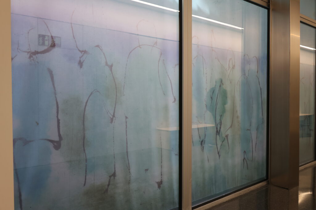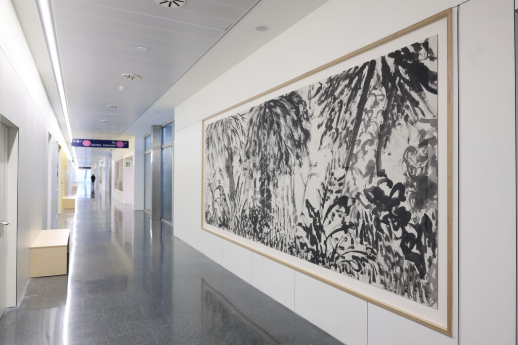 Lejos de ser un simple espacio de paso, este largo recorrido se convierte en una inmersión visual. Una ‘selva’ en blanco y negro acompaña a quien la contempla, mientras figuras singulares (inspiradas en profesionales de la salud) aparecen a lo largo del trayecto, guiando y sorprendiendo al mismo tiempo.